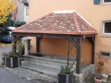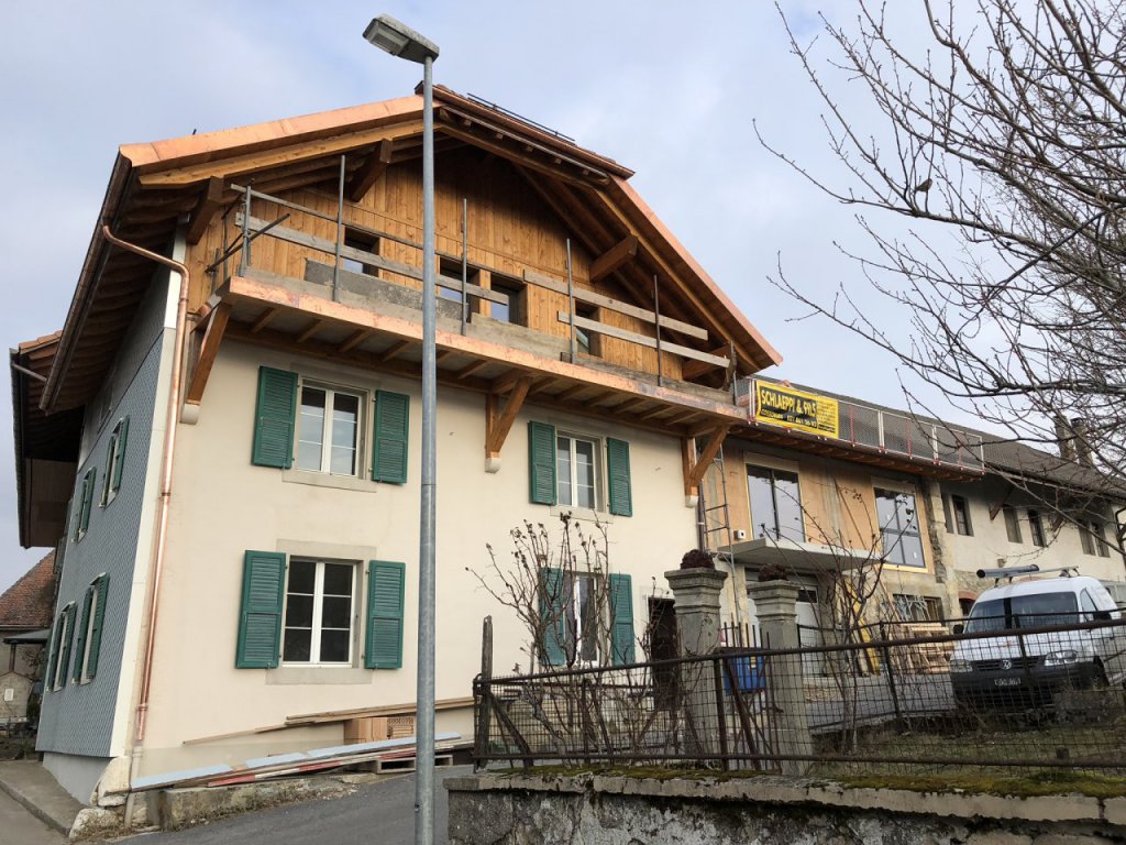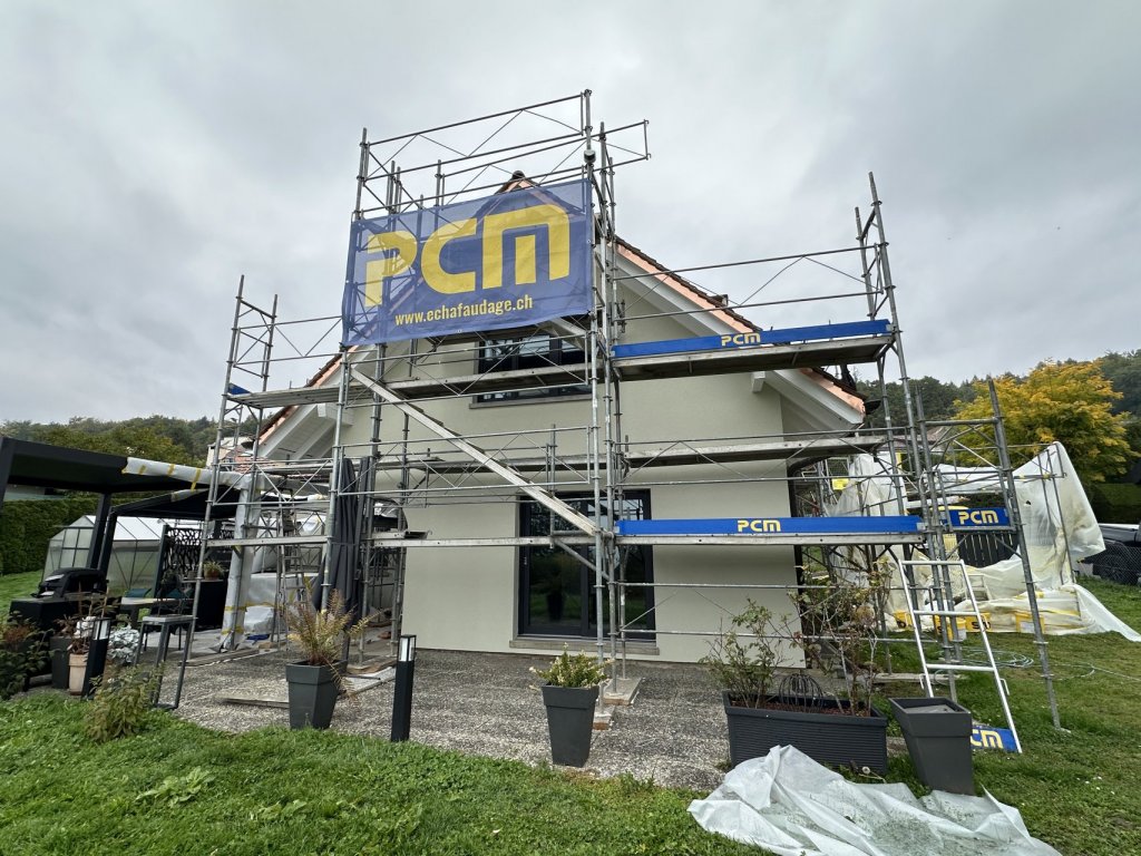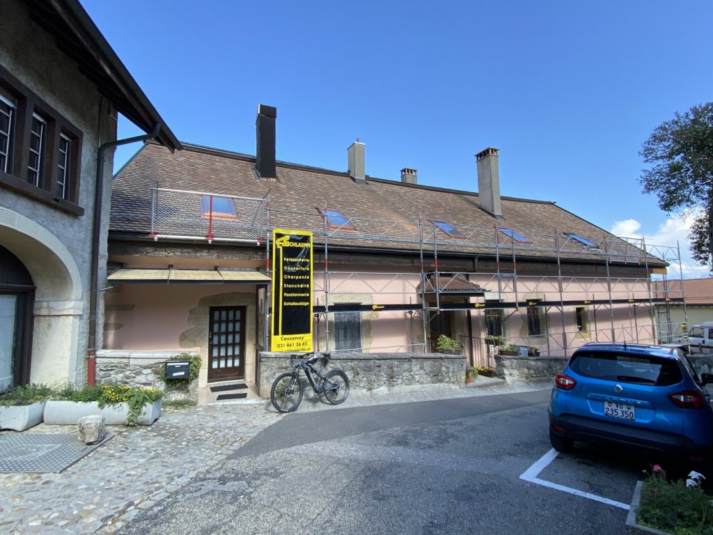Echafaudage, ferblanterie et couverture en Bardonnex pointue nuancé rouge.