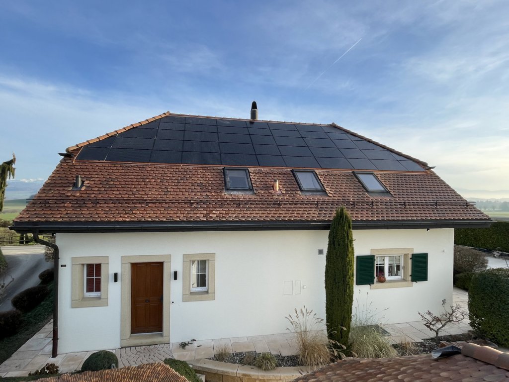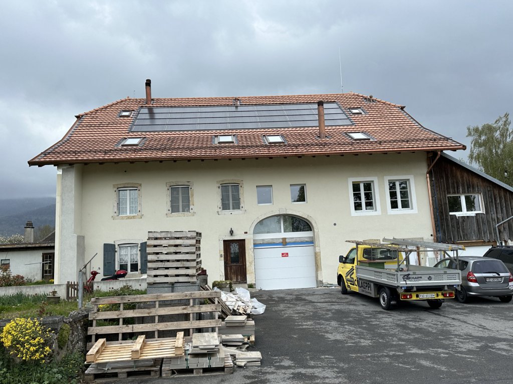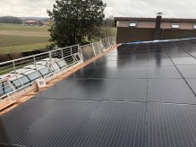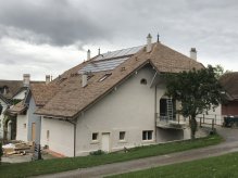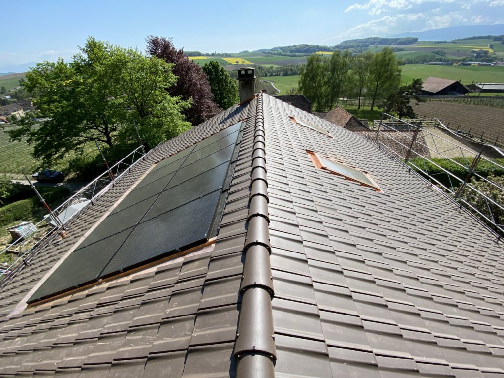 - Pose de 273 m2 de tuile solaire Panotron sur le pan sud, 19.8 kWp