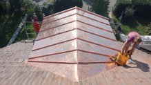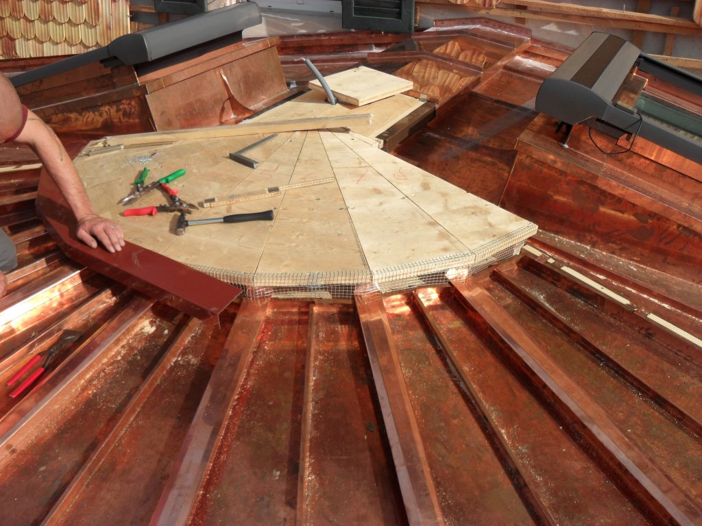 ,pose d'une sous-couverture ,ferblanterie en cuivre, ornements,paratonnerre et couverture neuve en petite tuile.