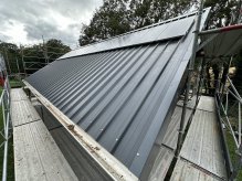 Echafaudages,pose d'une sous-couverture neuve et toit sud en photovoltaïque avec ferblanterie.